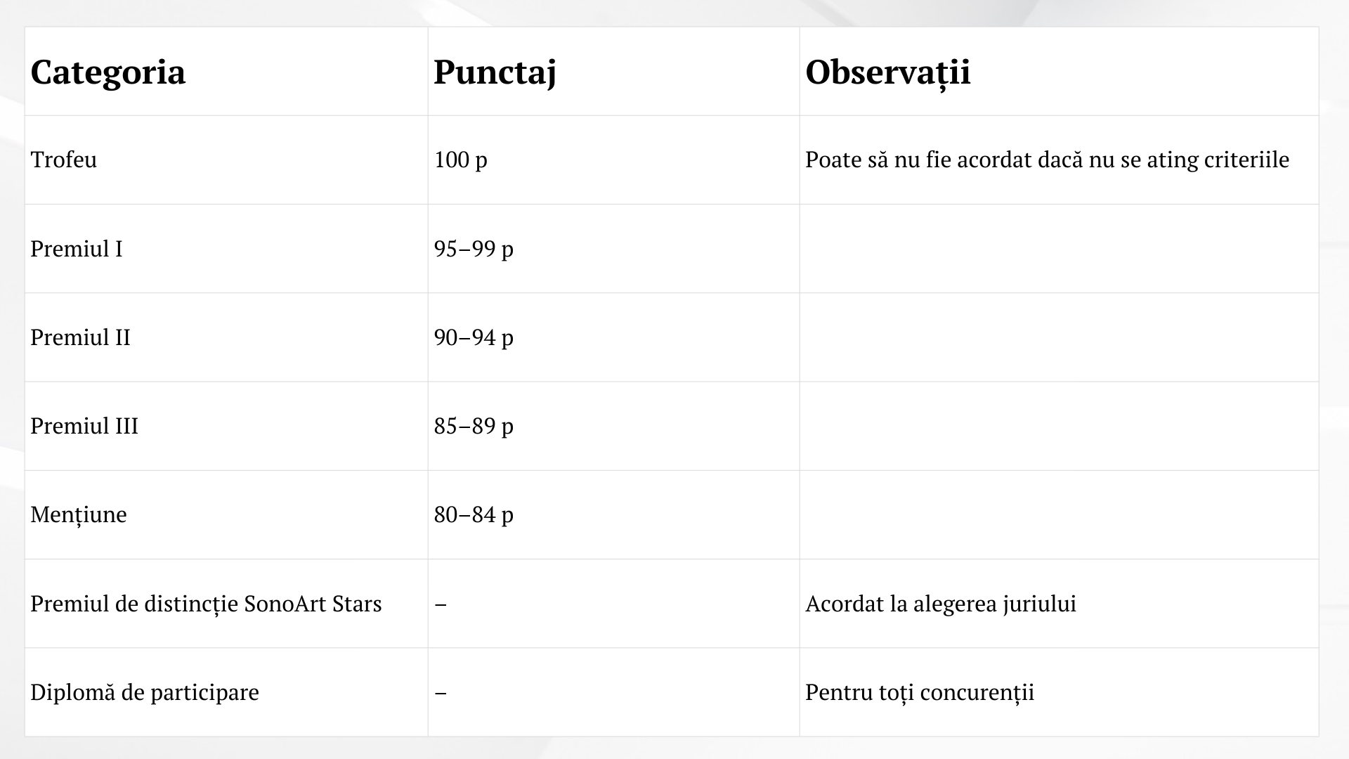 • Concurenții se vor prezenta la concurs cu acompaniator propriu. Organizatorii concursului nu asigură acompaniator;