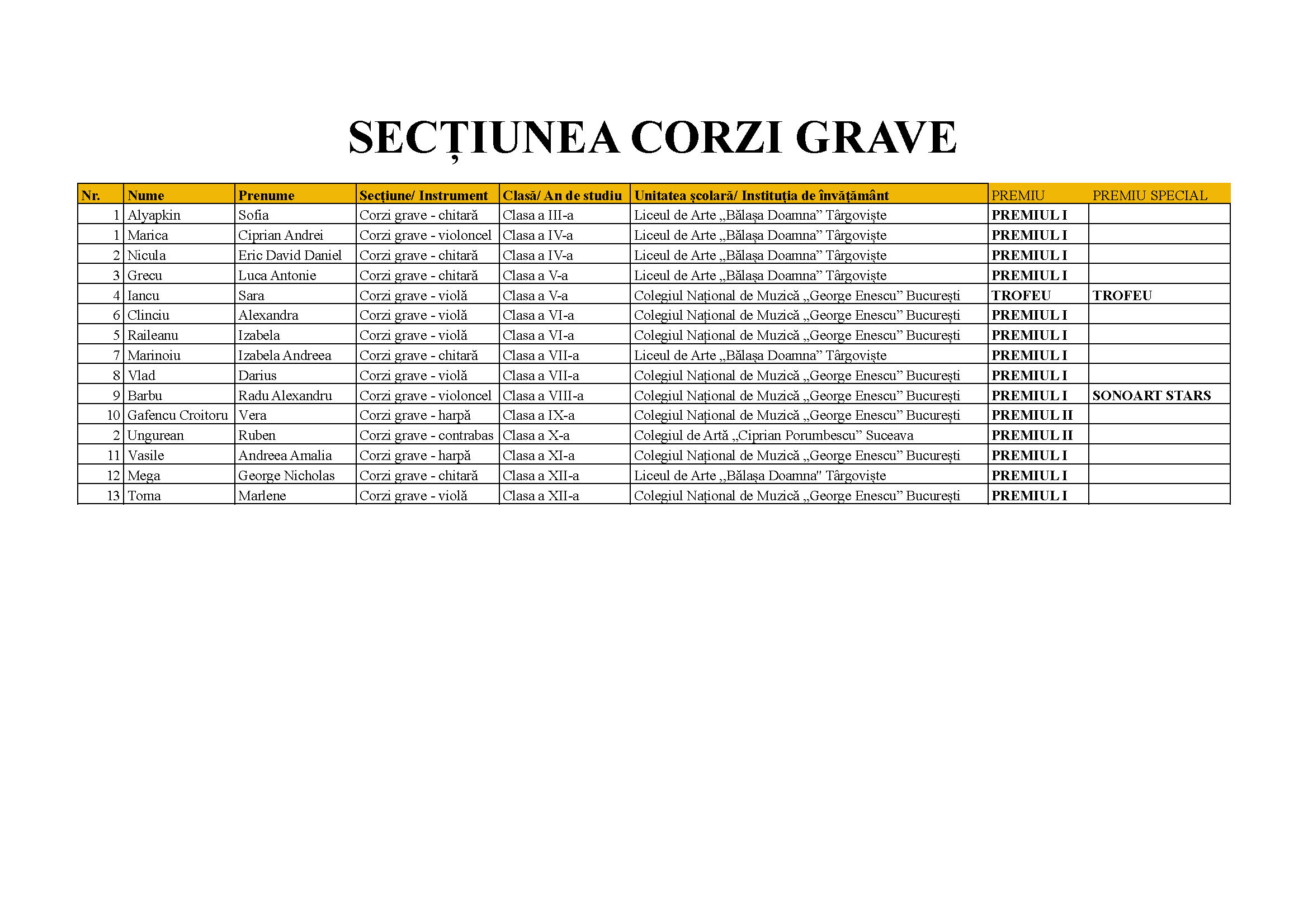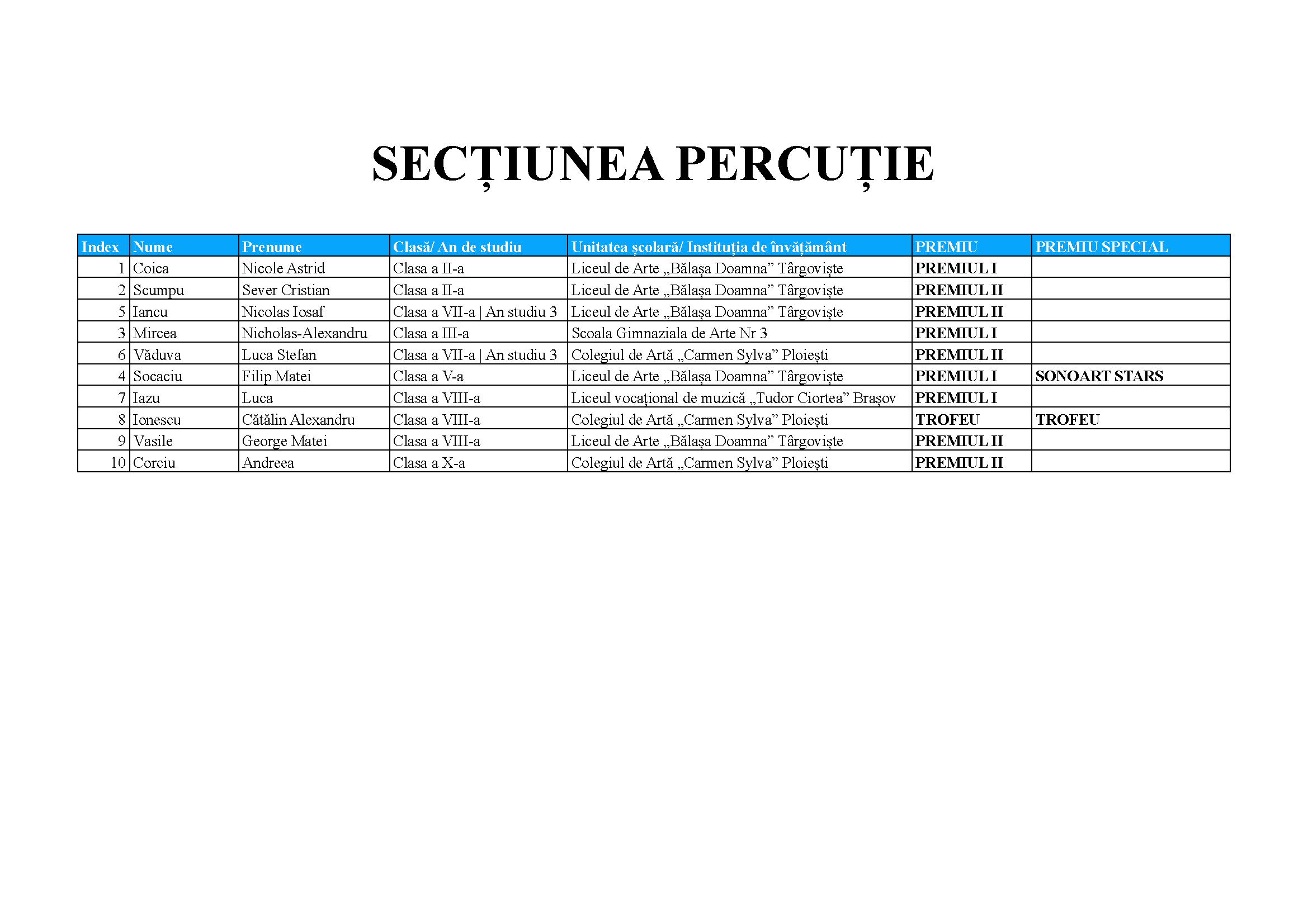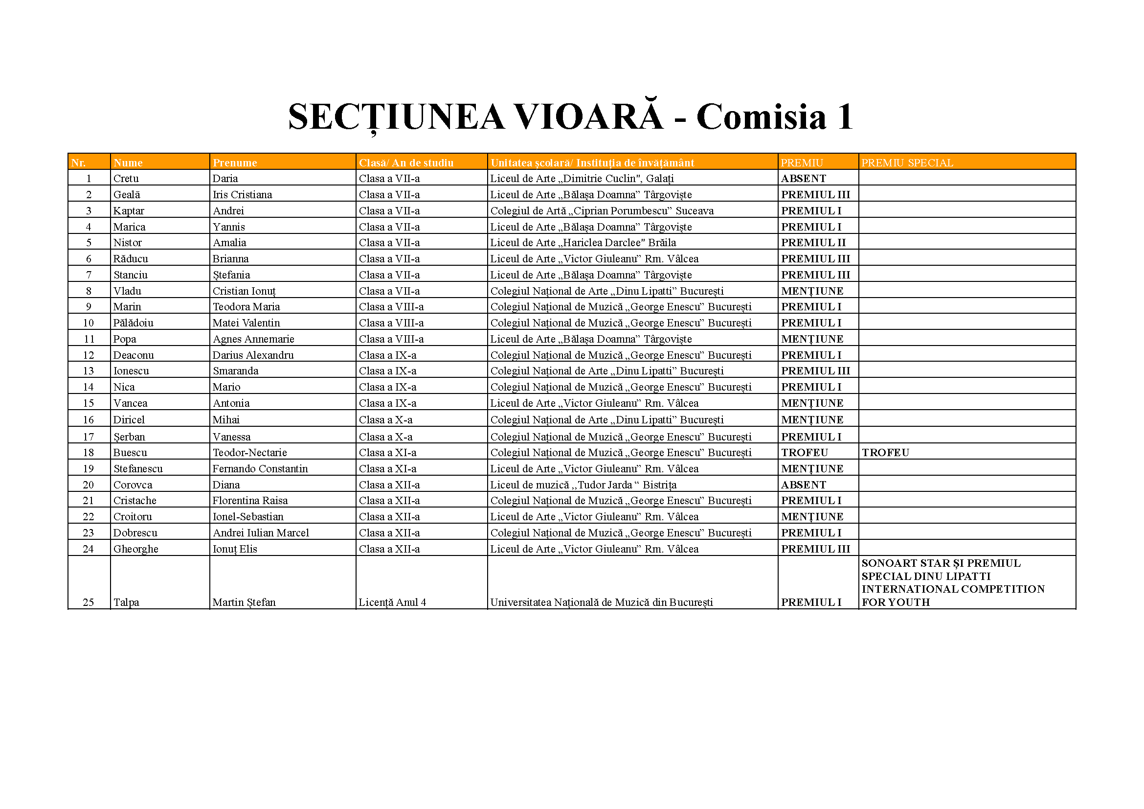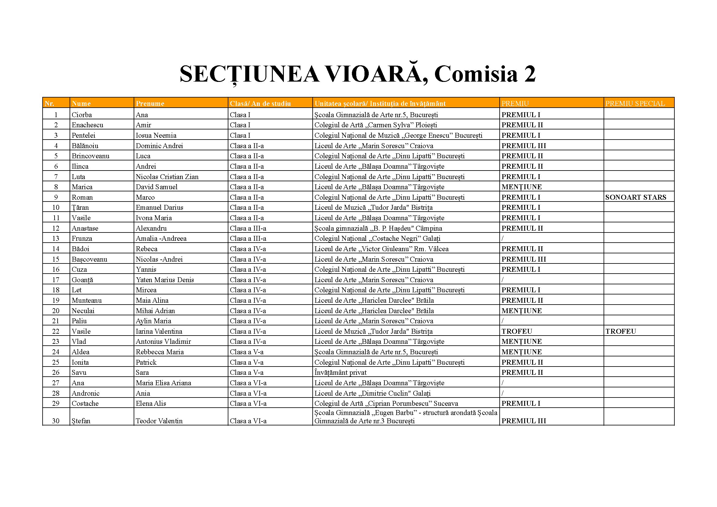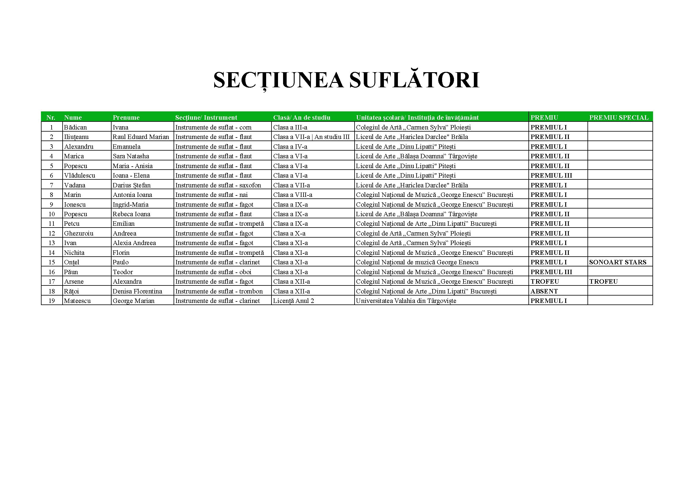 Mai jos sunt prezentate rezultatele concursului.